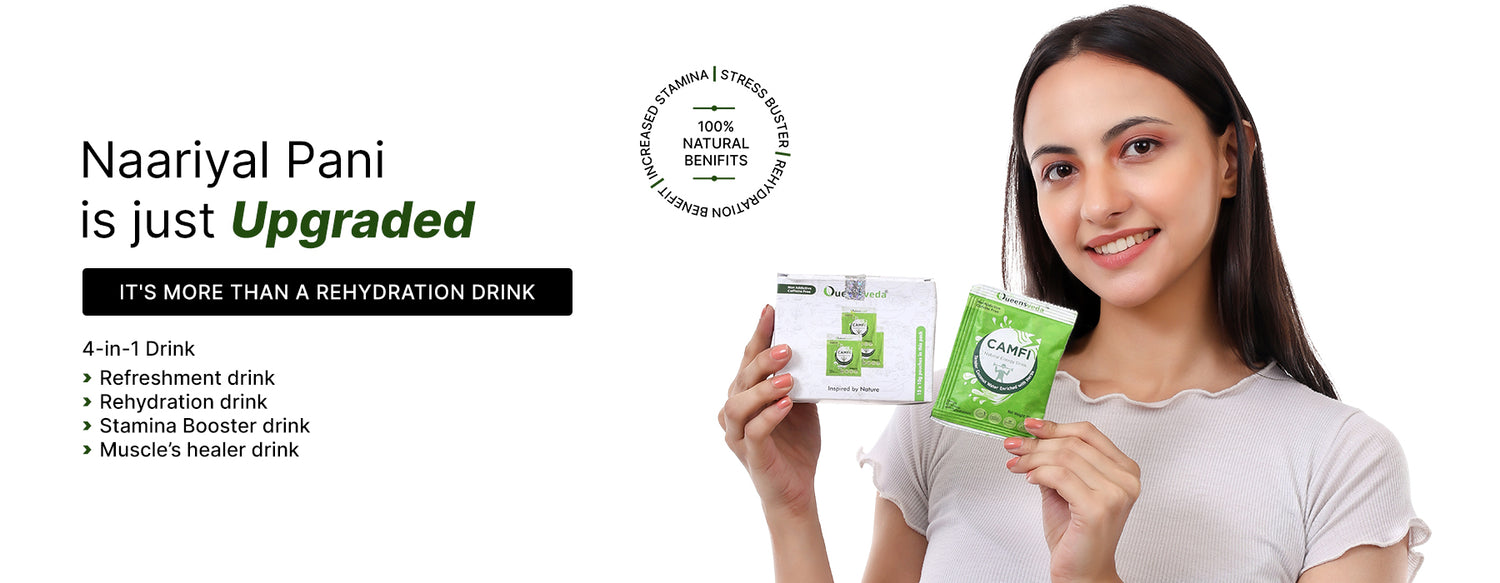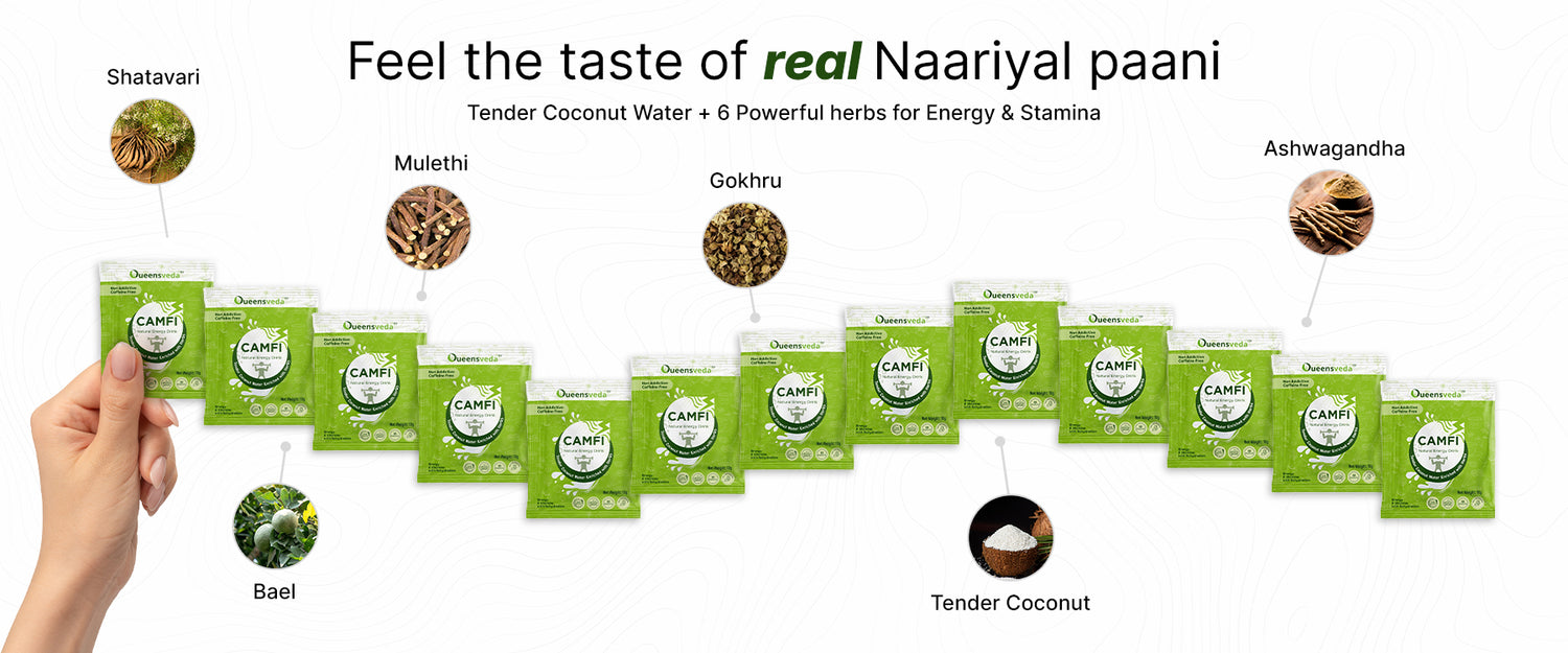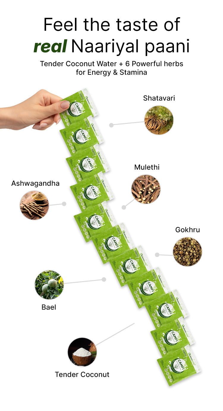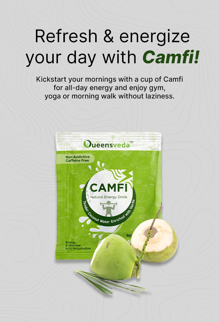 Caffeine-free natural energy drink: Camfi is prepared with tender coconut water and Ayurvedic ingredients. It provides steady and clean energy throughout the day.